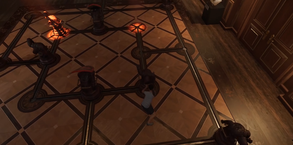 要解开小劳拉的谜题,关键在于将两个带盾牌的棋子移到正对马的位置,让光线反射到正确的地方,其余的棋子位置可以随意摆放。这个谜题发生在克劳馥庄园的一次童年回忆中,小劳拉为了探索禁忌古墓而展开行动。进入关卡后,你需要先跟随提示,从右侧的花架向上爬