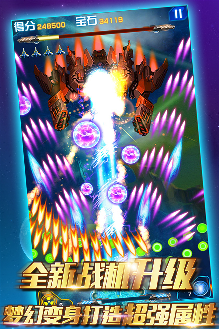 2.升级系统:通过游戲中的货币system进行战机升级,提升火力、防御、特技等性能。