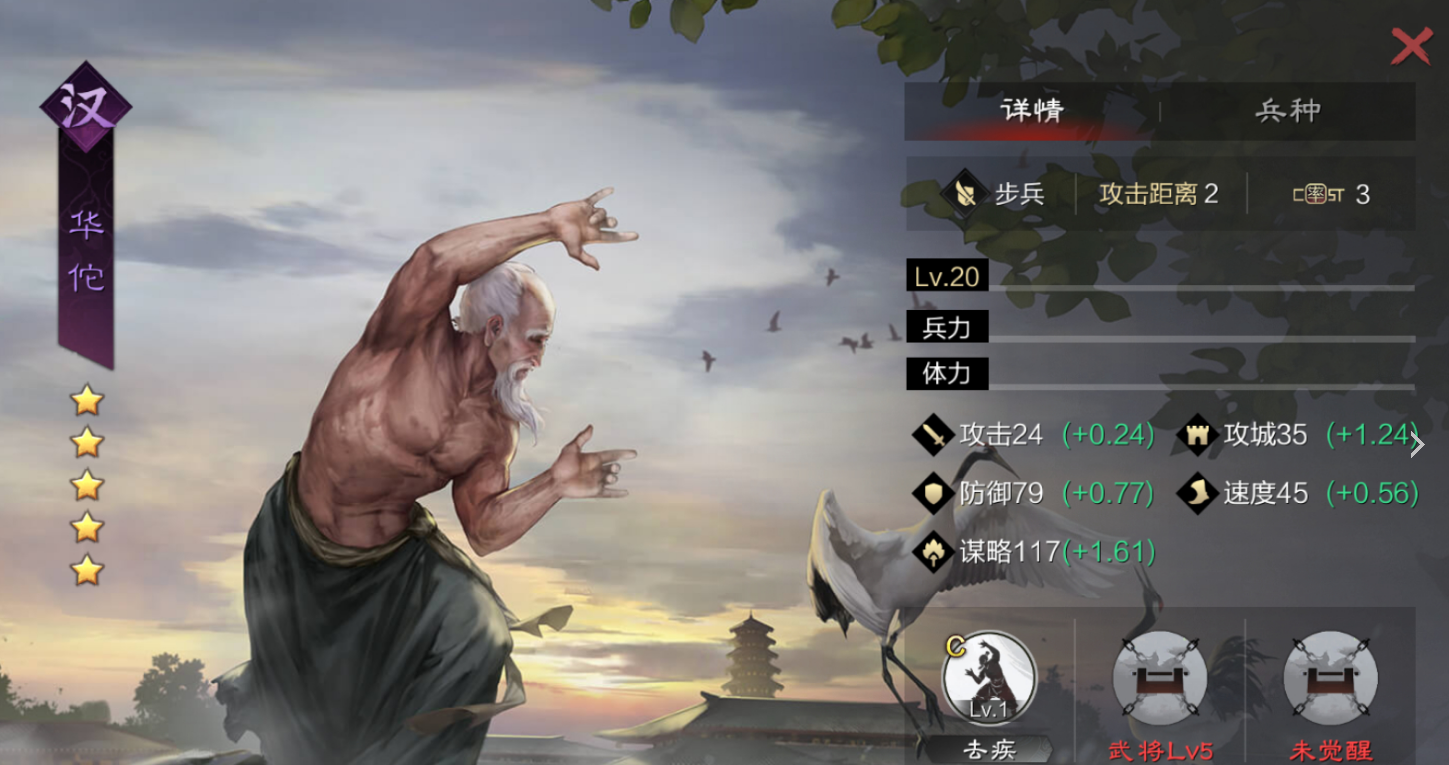 华佗的定位为辅助型武将,其核心战法去疾能为友军群体提供稳定兵力恢复,并有概率触发额外治疗。该战法受谋略属性加成,因此搭配时应优先提升其谋略值。华佗的防御属性较弱,通常需避免置于前锋位置,建议配置于大营或中军,配合减伤类武将或战法降低战损。由