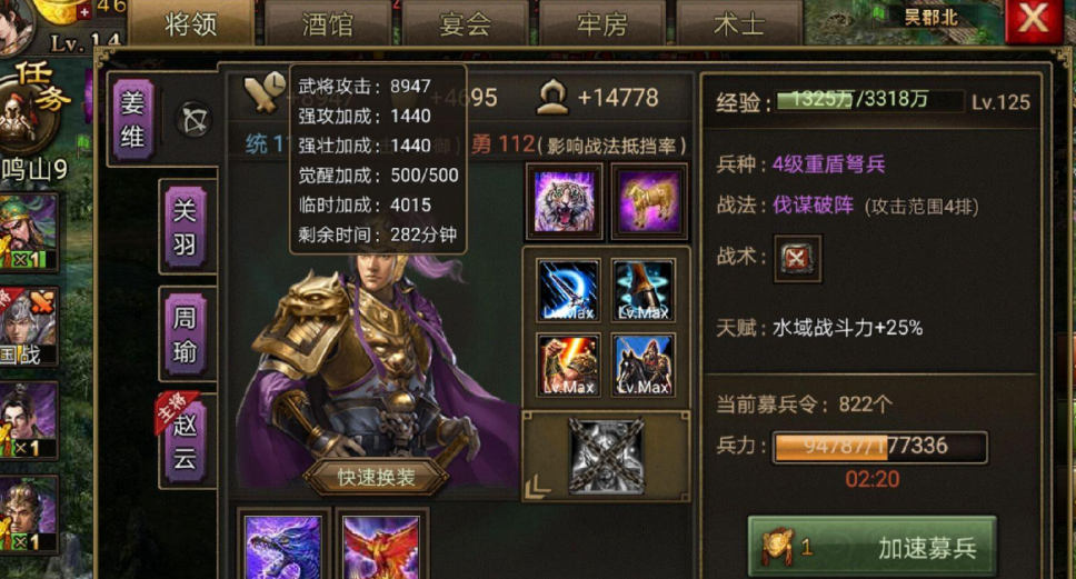 在攻城掠地93级阶段,武将选择直接影响副本通关效率和国战表现。刘备和魏延是当前版本公认的T0级武将,刘备凭借骑兵类高统率能力在冲锋和防守中表现突出,魏延的远程压制能力能稳定消耗敌方血量。关羽和诸葛亮属于T1梯队,关羽的高防御特性可有效保护队