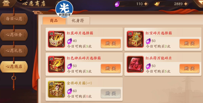 咱们最优先兑换的肯定是金将碎片箱子,这玩意儿对平民玩家特别友好,每天稳定拿碎片,慢慢攒就能凑齐金将。其次是体力丹,别看它平时不起眼,等武将觉醒开了就知道有多香了,每天花50水晶换10个体力丹绝对不亏。幽蝶羽毛也值得换,但要注意这玩意儿只能买