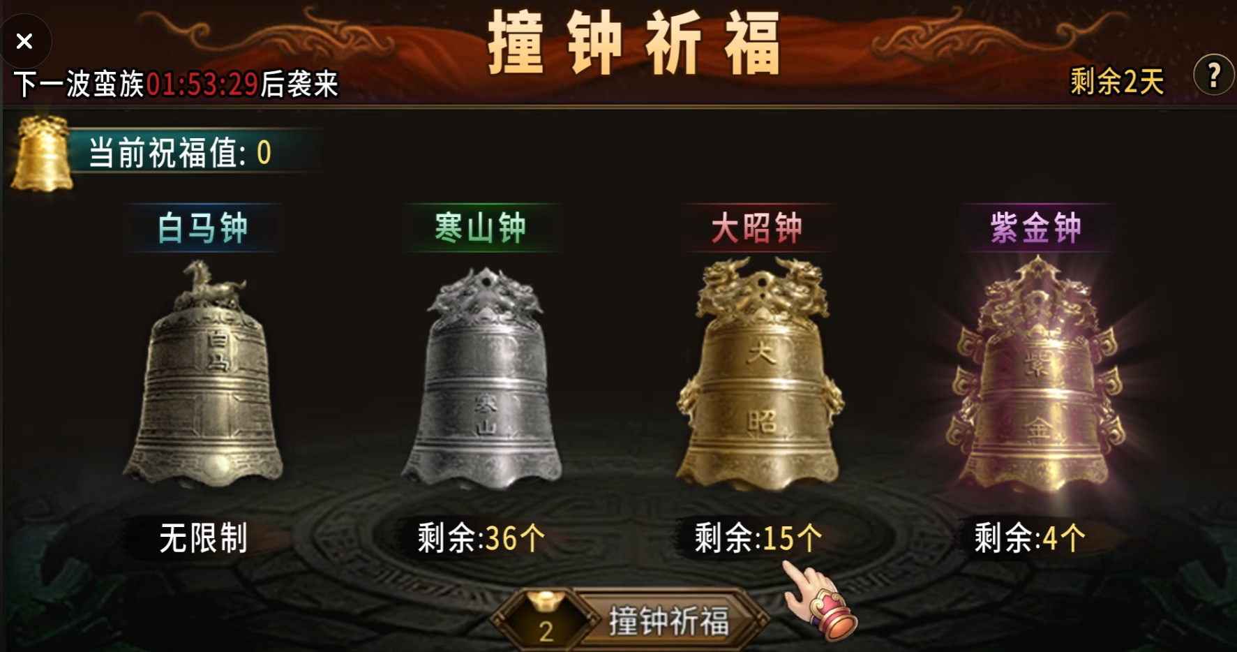 撞钟祈福可是奖励最丰厚的玩法之一,每次持续三天,每天在固定时间参与就能拿到各种稀有资源。剿灭蛮族、撞钟祈福和用攒的祝福值兑换奖励。撞的钟分好几种,品质越高给的祝福值和资源也越好。有只给5点祝福的白马钟,有给50点祝福的寒山钟,还有给祝福的同