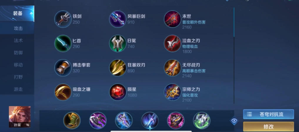 装备构建需结合战场形势灵活调整,常规对抗方案以暗影战斧、抵抗之靴和破军为核心。这套搭配兼顾爆发与穿透,能有效切后排并应对中期团战。暗影战斧提供冷却缩减和物理穿透,破军则增强残局收割能力,是孙策的标准出装路线。开局可以先出铁剑抢线权,鞋子根据