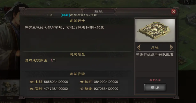这时候分城的重要性就体现出来了。分城建起来以后,你可以多造一套资源建筑,满级之后每小时能多拿不少粮食、木材、石头和铁矿,相当于白捡了好多块高级地。而且分城里的民居升满级,铜币产量非常可观,对于天天要抽武将、研究战法的我们来说,铜币可是永远不