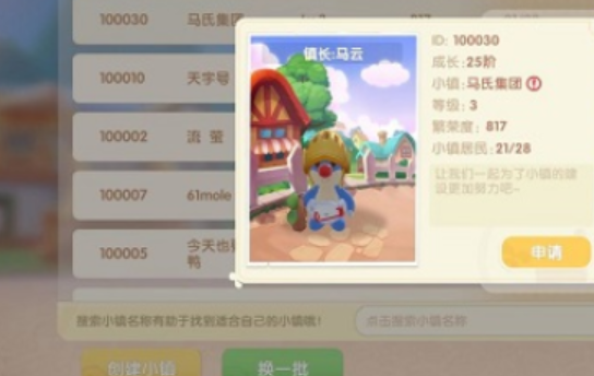 小镇就像其他游戏中的公会,是一个大家一起玩的集体玩法。当你完成了游戏中的热气球任务后,就可以选择创建自己的小镇或者加入别人建好的小镇。如果你决定创建小镇,需要花费5000摩尔豆,还要找至少一位朋友来响应你的创建请求。成功当上镇长后,你的庄园