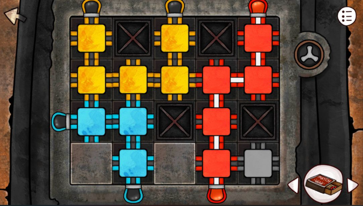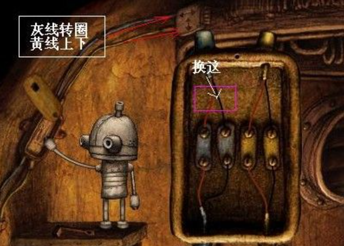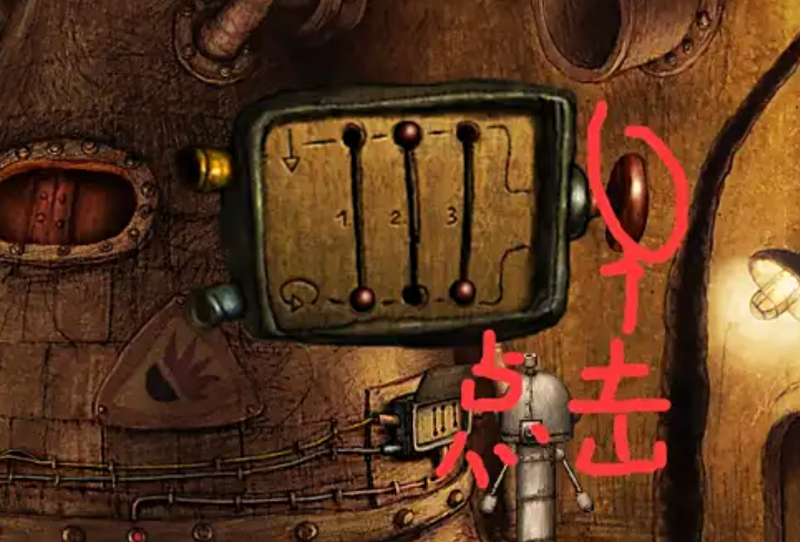 先到画面右下方锁着的门旁边拿到挂在墙上的钥匙,再到中间的锅炉处点击闪烁的小红灯,打开右侧开关盒。调整三个开关的顺序为下-上-下,按下红色按钮后迅速跳上矿车,等机械爪第二次抓住你时找准时机跳到左侧平台。用钥匙打开电线盒,交换红黑线改变爪子转向