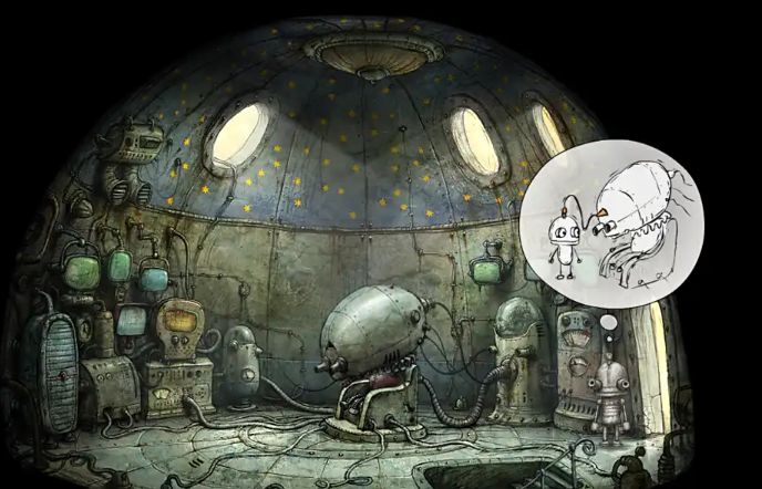 需要先搞定大脑袋机器人那边的任务才能回到电梯。上楼后会遇到一个唠叨的大脑袋机器人,和他对话后,他会让你回忆被当成垃圾运走的经历。这时候别急着走,画面左下角有一堆仪器,最里面的门上有个红色开关,点一下会弹出一个小游戏,目标是把三个绿色球移到绿