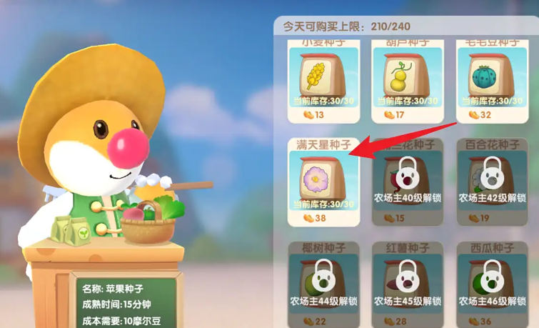 获得满天星种子,首先需要将农夫等级提升至30级或38级(不同攻略存在差异),同时确保与NPC梅森的好感度达到1颗心。满足条件后,打开右上角的商城,进入梅森的花园商店即可购买种子。如果商店未显示种子,可能是好感度不足或等级未达标,记得多和梅森
