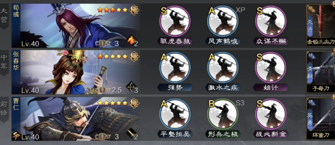 魏行兵是咱们非常经典的一支队伍,核心思路是利用形兵之极战法搭配魏国智将,形成稳定的输出和控制链。大营通常选择荀彧作为主力输出,中军带郭嘉或者曹仁提供控制和增伤,前锋则用荀攸或者张春华来扛伤和辅助。这套阵容的优势在于战法联动性强,面对各种主流