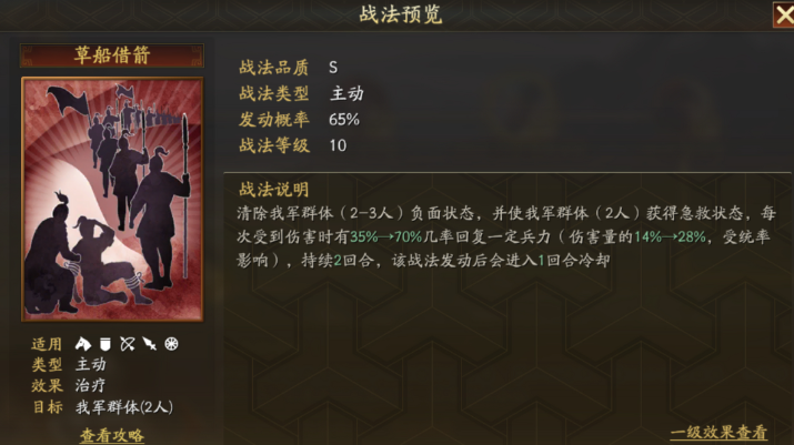 草船借箭是一个非常实用的事件战法,它能够在战斗中移除我方全体的负面状态,并为两名队友附加急救效果,在受到伤害时概率回复兵力。这个战法特别适合慢速阵容,能显著提升队伍的生存能力和持续作战表现。需草船借箭仅在PK赛季及之后版本开放兑换,玩家在早