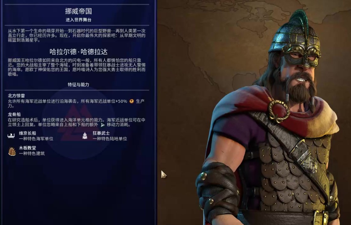 挪威文明在文明6中是一个高度依赖地图类型的文明,其独特的海军能力决定了它最适合在海洋资源丰富且海岸线漫长的地图上发挥优势。该文明的所有海军近战单位都拥有劫掠相邻沿岸地格的能力,这使得其早期就能对沿海区域进行骚扰和掠夺。而其特色单位维京长船替