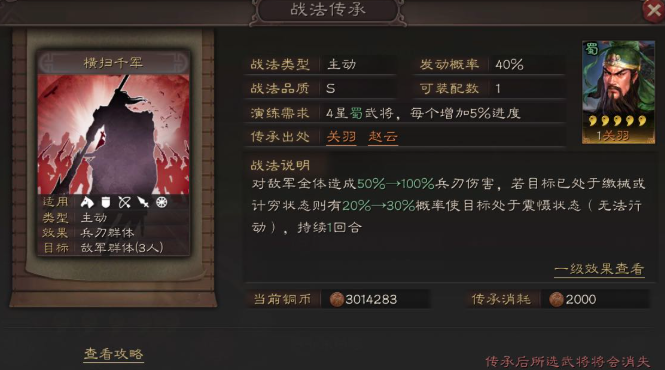 在战法选择上,刚勇无前和击其惰归是张飞的绝配,前者能大幅提升他的爆发伤害,后者则能提供一定的生存能力。如果没有这些高级战法,横扫千军和绝地反击也是不错的选择,既能补充伤害又能增强续航。盛气凌敌这个战法非常适合张飞,因为它能稳定触发缴械效果,配合他的破防能力,能让整个队伍的伤害再上一个台阶。