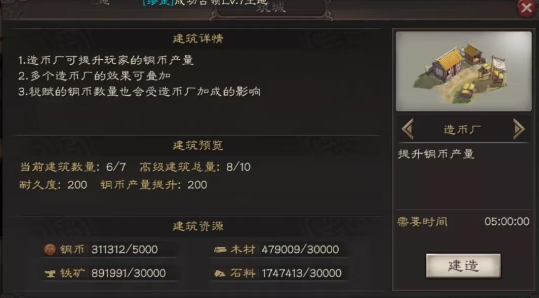 快速提升铜币产量,造币厂绝对是你的首选。造币厂是高级建筑,必须建在6级资源地上,名声达到6000后才能解锁第一个,之后每增加1000名声可多建一个,最多能建8个。建议优先选择离主城近的6级地,方便防守,同时注意资源地的兵种克制,避免被敌人轻易攻占。建造时需要消耗木材、铁矿、石料各3万和5000铜币,初期资源紧张的话可以先建1-2个,后期再逐步补满。
