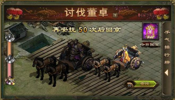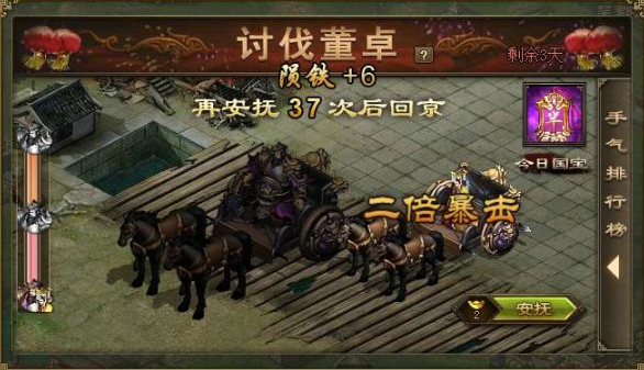鞭笞功能是讨伐董卓的关键玩法之一,在活动界面右下角就能找到。鞭笞董卓能拿到经验、点券、宝石甚至国宝等稀有奖励,每天还有一次机会拿到练兵符或者虎豹骑影子。鞭笞次数可以通过攻打董卓营寨随机获得,也能用金币直接购买。皮鞭会在第二天清空,所以最好留到晚上再用,这样能提高成功几率。国战时段也会有董卓来袭,击败他还能俘虏董卓,拿到更多资源。
