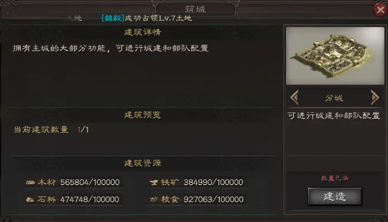 建造分城是三国志战略版中提升势力实力的重要手段,但需要满足特定条件才能进行。玩家必须将名声值提升至6000这是解锁分城功能的基础门槛。需要占领11块呈H型相连的土地,且中心地块等级必须达到6级或以上。同时还需准备木材、铁矿、石料、粮食各10万作为建造资源。这些条件缺一不可,建议在游戏中期资源积累充足后再着手规划分城建设。