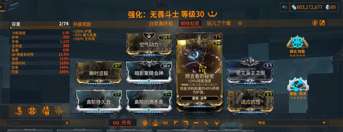 该战甲的配卡需侧重范围与效率属性。核心MOD包括过度延展、延伸、预言通灵等范围强化卡,以及简化、川流不息等效率类MOD。集团卡冷静与疯狂能显著提升技能效果扩散范围,建议优先装备。由于无畏斗士技能耗能较低,无需过度堆叠强度属性,保持200%左右范围加成即可覆盖大部分战斗场景。光环槽推荐装备侦敌雷达或腐蚀投射,前者可配合动物本能提升索敌效率。