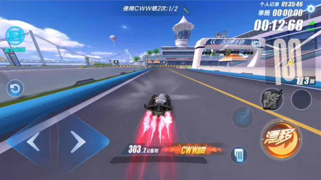 过弯道的流畅度直接决定了比赛胜负。想要实现高速且稳定的过弯,必须掌握基础漂移与进阶技巧的结合运用。CWW喷是最常用的出弯加速方式,适用于大多数直角弯和U型弯。操作分为四步:入弯时按住漂移键并调整车头方向,待小喷键亮起后松开漂移键,先触发氮气+小喷(CW喷),再快速点击第二次小喷完成加速。这一技巧能最大限度减少速度损失,但需提前储备氮气并精准把控松键时机。