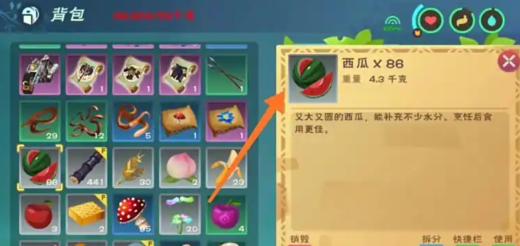 在创造与魔法中制作西瓜汁需要准备西瓜和甘蔗两种基础材料。西瓜主要分布在沙漠周围的高地,如枯骨山脉和乐乐河谷地区,而甘蔗则集中在乐乐河谷灯塔附近的雨林地带。收集到材料后,使用烹饪锅进行加工,将西瓜和甘蔗放入锅中点击开始烹饪即可完成西瓜汁的制作。西瓜汁能够为角色提供40点水分补充,是游戏中较为实用的基础饮品之一。