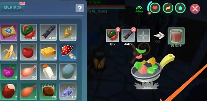 除了基础的西瓜汁配方,西瓜还能与其他材料组合制作更高级的饮品。例如加入珍珠和牛奶可以制成西瓜奶茶,提供45点食物和30点水分;与蜂蜜混合能制作西瓜沙冰,恢复40点食物和30点水分。但这些进阶配方需要额外收集特定材料,且恢复效果与基础西瓜汁存在差异。玩家可根据实际需求选择制作不同等级的西瓜类饮品。