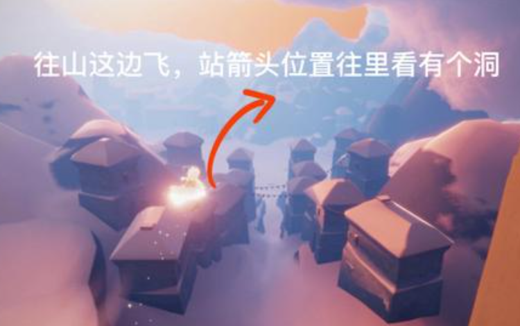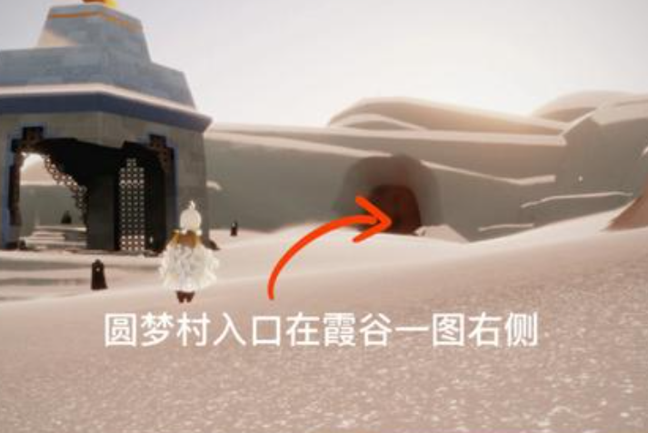 进入圆梦村需要从霞谷地图右侧的隐藏洞口进入。首先传送到霞谷大厅,视角调转右后方,可以看到一个被屏障封锁的山洞。解锁该屏障需要已收集至少一个墓土先祖,点火开启后即可滑入洞中。沿着长下坡滑行到底部,便能到达圆梦村区域。若未解锁屏障,需优先完成墓土先祖的收集任务。