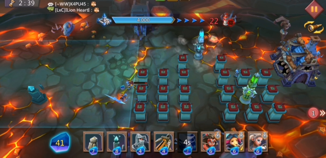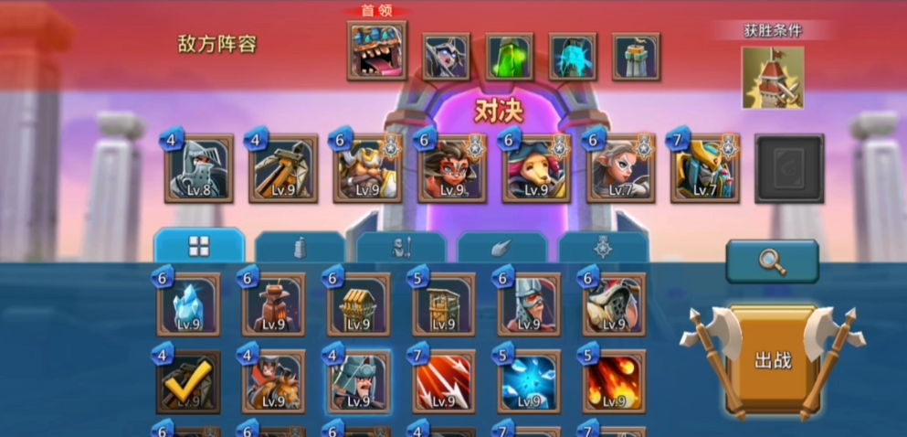 这关的核心思路是用克制英雄的步兵海战术来破局。对面的英雄攻击力高得离谱,常规的肉盾英雄冲上去两刀就没了,但只要你攒够专门克制英雄的步兵卡牌,慢慢推线就能稳过。记得在兵线推进时用炮车和魔像配合清掉沿途的炮台,不然步兵会被炮台收割得很惨。