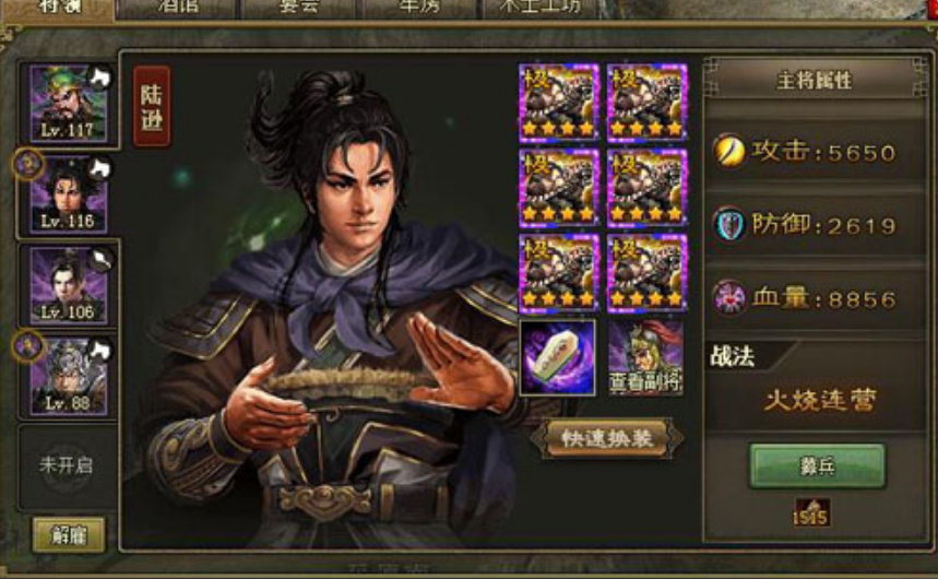赵云是第三个出场的核心武将,他的战法能对第三个敌将和主将曹操造成大量伤害。赵云上场后直接撞掉第二个敌将的残血,触发战法打残第三个敌将的前三排,接着继续平砍。如果赵云能顺利放完二次战法,曹操的前三排也会变成残血,这时候副将诸葛亮可以上去补刀,尽量多消耗曹操的兵力。