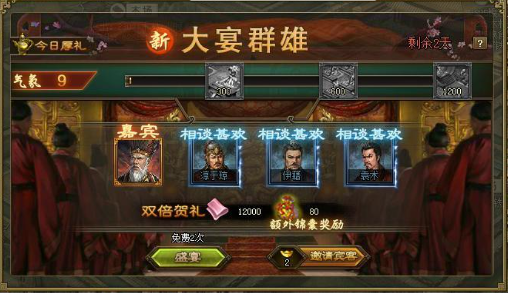 活动分为宴请和邀请两种方式,每日提供两次免费宴请机会,消耗完毕后需用金币补充。宴请可直接获得基础奖励,而邀请则需要通过请柬召唤武将,其品质分为普通、稀有等不同等级。同时邀请三位同品质武将可显著增加氛围值,从而激活更高档位的奖励。需注意,部分稀有武将需通过特定条件解锁,优先积累请柬以邀请高价值武将是高效参与活动的策略之一。