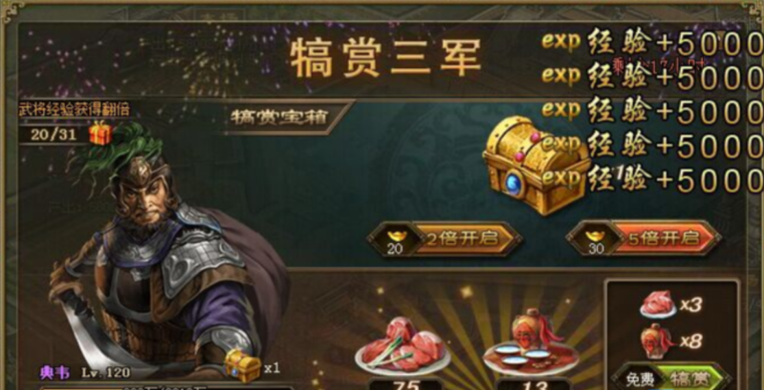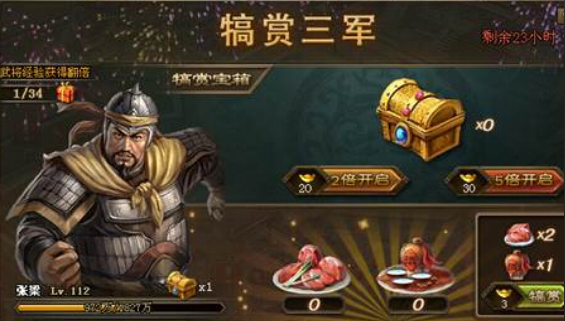 普通犒赏是提升武将经验的重要途径之一。玩家需要通过参与世界事件和功勋榜来筹集牛肉和美酒,达到一定数量后即可进行犒赏。每次犒赏都能为武将提供经验提升,并有概率触发暴击,获得额外经验奖励。犒赏顺序按照武将品阶从低到高进行,即白色将优先于紫色将。活动期间新招募的武将也可参与犒赏,但需注意活动结束后未使用的牛肉和美酒会消失,因此需合理规划资源使用。