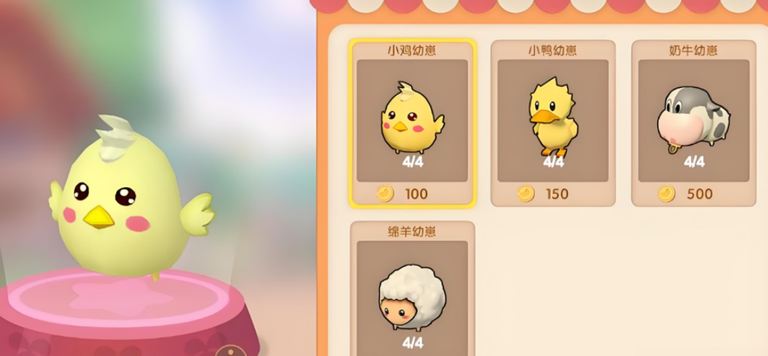 小鸭子需要在尤尤的牧场商店购买,每只价格是150豆子,一次最多买两只。买完小鸭后别急着找,先看看家禽小屋是不是满员了。如果之前养的动物太多,小鸭会乖乖待在仓库等主人来接它。养小鸭和小鸡的总数不能超过四只,这个设定要记清楚,不然可能会手忙脚乱。
