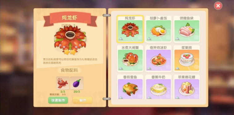 除了直接出售,将农作物加工成料理再出售是更高效的获利方式。玩家可以在餐厅将农作物制作成食物,如葡萄甜浆、咕唧蛋挞等菜品,其利润远高于原材料。部分料理如夏日解暑冲饮、炖龙虾等具有较高的出售价值。需料理制作需要解锁对应食谱,且需手动操作,无法像农作物那样批量处理。