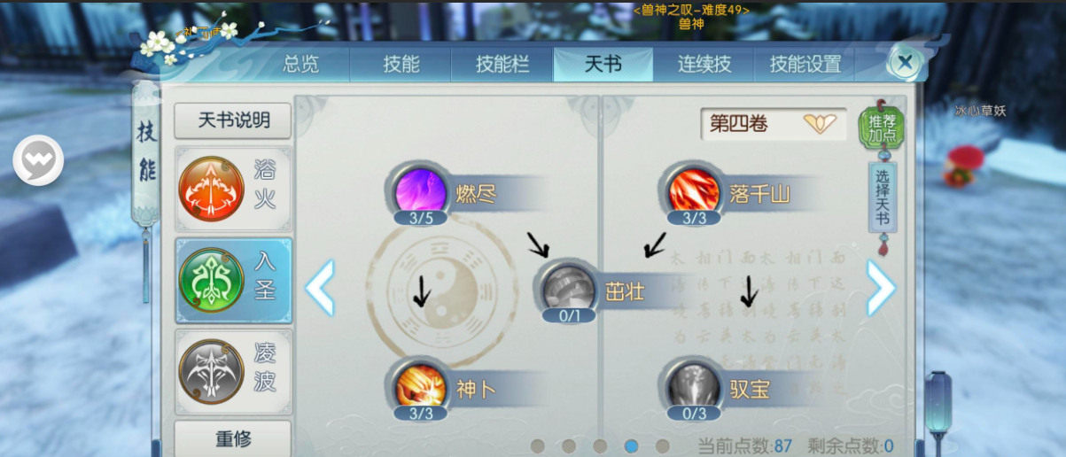 技能加点需侧重浴火系天书第一卷千耀,放弃入圣系第五卷以节省点数。三云龙仅需投入1点作为减速控制,炫光诀1点触发天命效果即可,多余点数分配给被动提升爆伤和气血。星芒击必须点满,其600%气血伤害加成的斩杀效果与天书二加成的联动性极强。狐闪作为解控位移技能,配合天书飓风可获得35%移速加成持续6秒,有效改善烈山机动性短板。