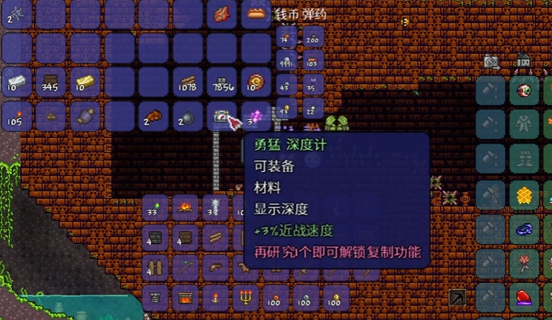 深度计是个超实用的信息配饰,能显示你当前所处的地下深度。它会把地表和地下层的交界线设为0深度,显示为水平面。电脑版和主机版用英尺单位,一个图格等于两英尺;老版本用米单位,两个图格一米。记住它不需要装备在配饰栏,放在背包里就能生效,但装备到时装栏就没效果了。