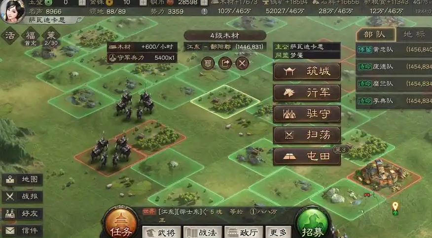 资源是这一切的基础,你的领地、资源地等级和城建中的资源建筑(如农场、采石场等)共同决定了每小时产量。前期跟着游戏内的主线任务走,能获得大量资源奖励,帮助你度过开荒期。占领更高级的资源地(比如5级地)能显著提升资源产出。不要忽略屯田功能,它能让你在短时间内快速获取指定资源,是应急和冲刺升级的好帮手。在资源分配上,你需要做好规划,确保石料、木材和铁矿的供应能支撑起兵营以及其他关键建筑的升级消耗,避免出现某一种资源严重短缺卡住进度的情况。