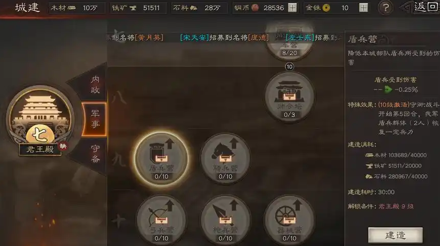 兵营和军营提供了兵力基础,但部队的全面强化还需其他建筑配合。这就是兵战四营(兵战-武、谋、防、速)和五大兵种营(盾兵、骑兵等)的作用。兵战四营满级后能为所有武将提供各20点的属性加成,别看数字不大,在实战中累积起来的效果非常明显,尤其是速度属性,关系到出手顺序,至关重要。升级顺序可以根据你的主力队伍来定,比如武力队优先升兵战-武,谋略队优先升兵战-谋。而五大兵种营则在君王殿9级、10级后陆续解锁,能进一步提升特定兵种的属性并解锁特殊效果,你应该根据自己主力队伍配置的兵种,优先升级对应的兵种营。