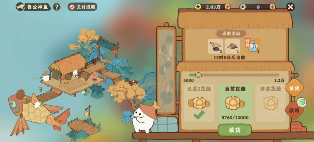 解锁之后,鲁公神鱼怎么玩呢?它的核心玩法其实就是进行贸易航行。你需要在水产养殖区域收获各种鱼类和水产,然后将它们作为货物装载到鲁公神鱼上。游戏会有一个收购界面,上面会列出当前需要收购的货物种类和它们各自的价值,你需要根据自己仓库的库存,有选择地将货物提交上去。装载货物有一定技巧,比如优先提交那些标识为奇货的高价值货物,因为它们能带来更高的载货量评分。货物装满一个统一的货仓后,你可以手动选择发船,神鱼就会出发去贸易了。