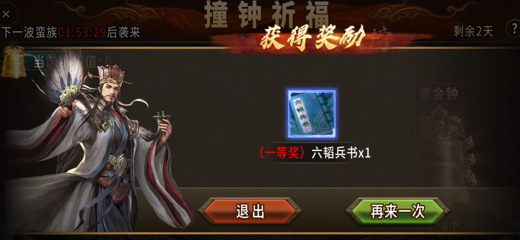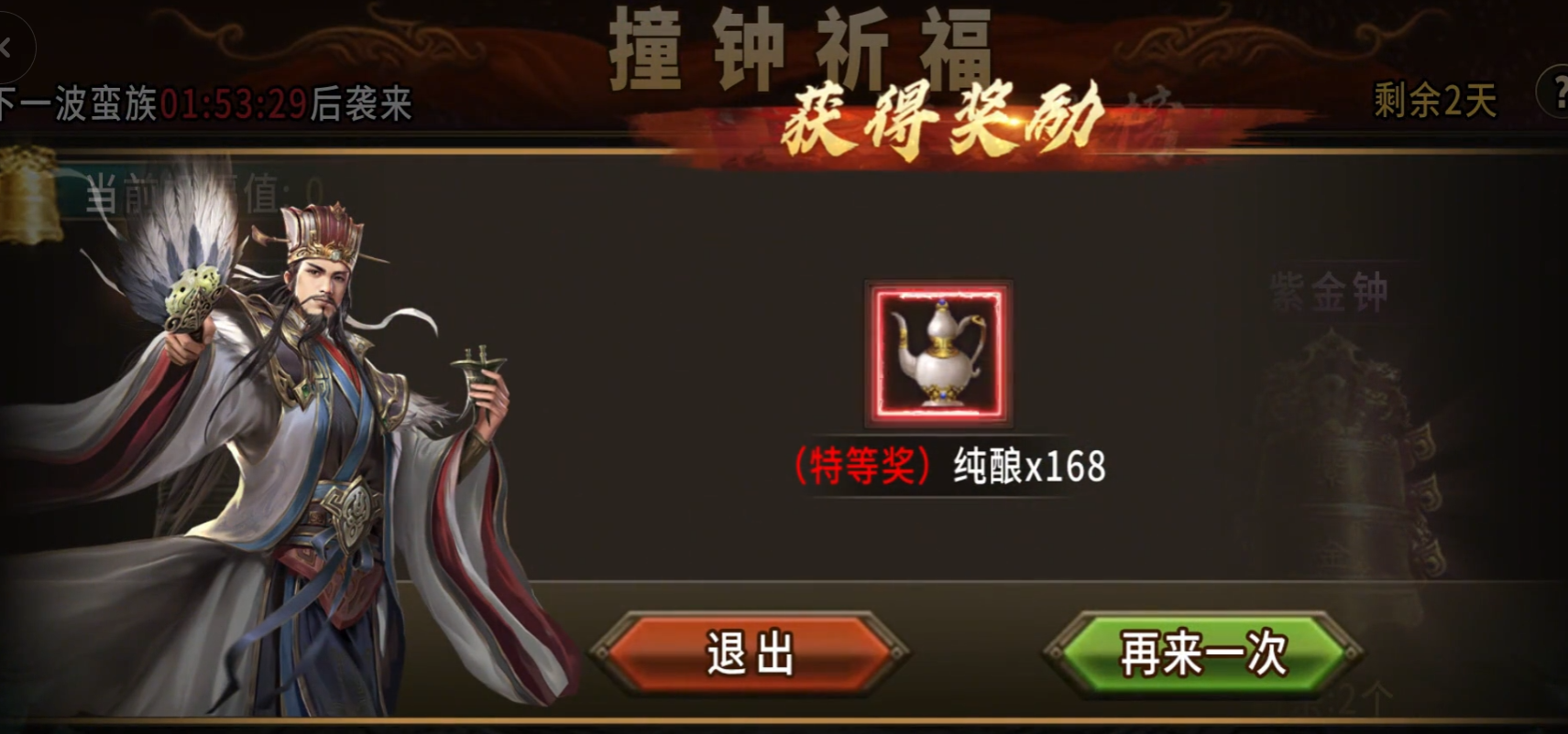 撞钟祈福可是奖励最丰厚的玩法之一,每次持续三天,每天在固定时间参与就能拿到各种稀有资源。剿灭蛮族、撞钟祈福和用攒的祝福值兑换奖励。撞的钟分好几种,品质越高给的祝福值和资源也越好。有只给5点祝福的白马钟,有给50点祝福的寒山钟,还有给祝福的同时额外给陨铁袋的大昭钟,以及给孔明锁的紫金钟。