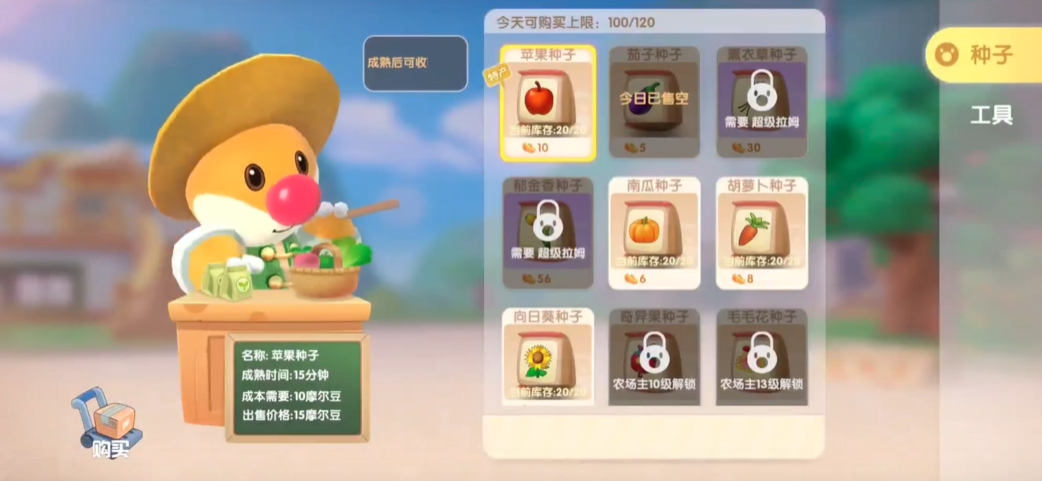 你点开游戏右下角的店铺,就能找到梅森的店。不过这里有个小门槛,商店里的玉米种子不是随时都能买的,需要你的农场主等级先提升到19级才会解锁。解锁之后,你就可以用摩尔豆直接购买了,每颗种子价格是11摩尔豆。自己种出来的玉米,除了是任务必需品,也可以卖给花婶回收换点豆子,或者留着做菜,非常实用。记得多完成日常订单、采集物资或者手动钓鱼来积累经验,快快升级哦。