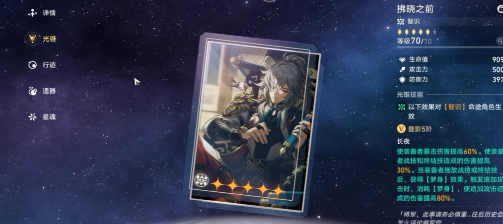 新手可以优先提升景元的暴击率属性,这是他的核心培养方向。光锥方面优先考虑专属光锥拂晓之前,它能大幅提升暴击伤害和追加攻击加成,如果资源紧张,用今天亦是和平的一日或我的诞生这些四星选项也能提供不错的过渡效果。遗器推荐使用激奏雷电的乐队四件套配合停转的萨尔索图两件套,这样能同时增加雷属性伤害和暴击率,让新手更容易看到成长回报。