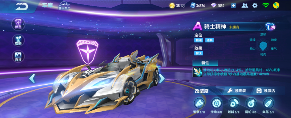 而在星辰许愿池中车辆的阵容会随时间更新例如历史上曾有黑金与极光分别加入两个池子。该池中的S破晓者作为早期职业联赛专属车辆,其特性同时具备速度加成和自动集气功能,在特定时期曾是热门选择。另一个值得关注的车型是极地战甲,它的特性使其在发生碰撞时有一定优势,耐撞性能较为突出,因此更适合在道具赛模式中发挥作用,但其竞速表现相对而言不如专门的竞速车型。