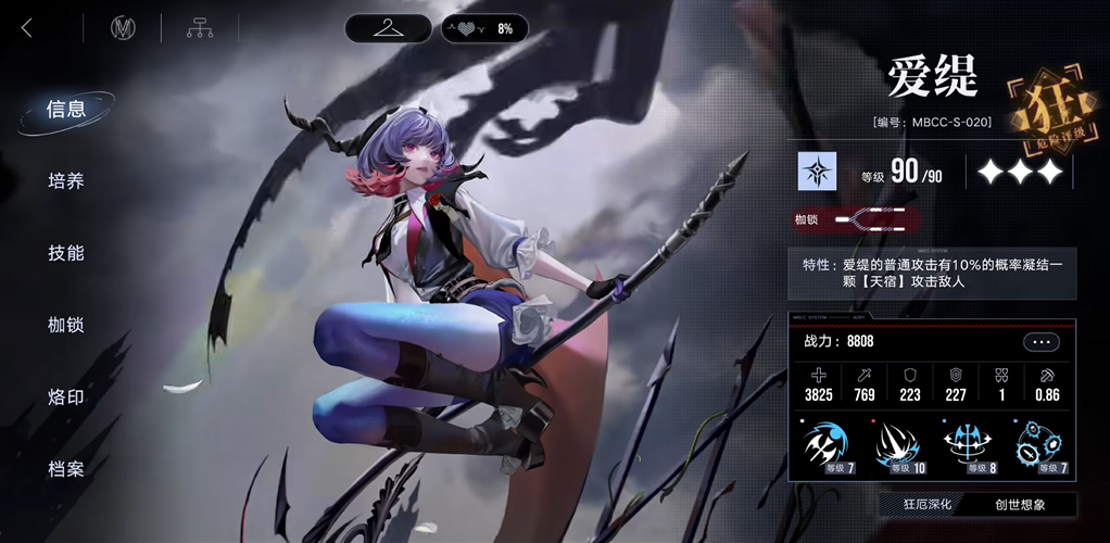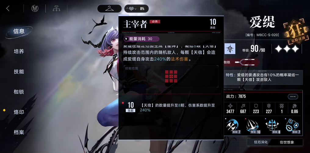 除了通用套装,爱缇的专属烙印为她带来了显著的强度提升,其效果非常值得投入资源开启。她的专属烙印能使天宿在攻击后,提升所有天宿对该目标的后续伤害,并且这个效果可以叠加。这意味着爱缇在持续攻击同一目标时,伤害会越打越高,面对高血量敌人时优势明显。在资源允许的情况下,考虑为爱缇开启专属烙印,尤其是提升到三级,能够让她在长线作战或对抗世界首领等场合中发挥出更恐怖的输出潜力。