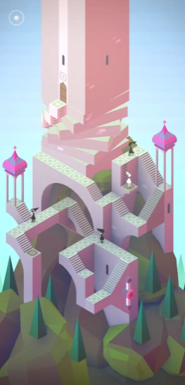 第五章尖塔的通关核心在于理解场景中乌鸦人的固定移动规律,并熟练操作各类旋转机关来改变道路的连接方式,从而为公主艾达开辟安全的通行路径。这一关的挑战主要来自于需要躲避或巧妙利用场景中沿固定路线巡逻的乌鸦人,它们会阻挡艾达前进,但不会导致游戏失败,玩家需要通过调整建筑结构来规划路线或暂时困住乌鸦人。整个关卡由多个相连的塔楼场景构成,每个场景的解谜逻辑都围绕着操作墙壁上的旋转把手或带圆钮的墙壁来拼合道路。