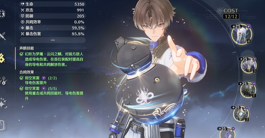 声骸搭配直接影响角色的输出上限,目前版本中,为相里要搭配声骸主要沿用彻空冥雷四件套,该套装效果能在施放重击或共鸣技能后提升导电伤害。另一实用方案是彻空冥雷与不绝余音组成2+2组合,兼顾导电伤害与攻击力加成。声骸的主词条应优先选择暴击率或暴击伤害,副词条则优先追求暴击、暴伤、攻击百分比以及共鸣解放伤害加成。