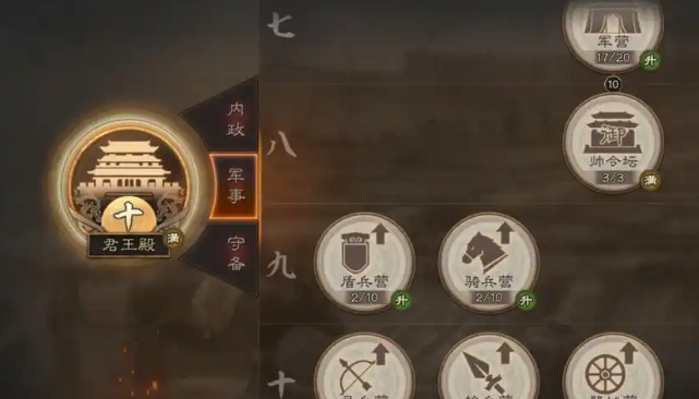 提升统御上限的主要途径是升级君王殿和帅令坛这两个关键建筑。君王殿在前期每提升一级即可增加1点部队统御上限,但当其等级达到8级后,继续升级将不再提供统御值加成。此时玩家需要转向升级帅令坛,每次升级帅令坛也能提升1点统御上限,从而逐步扩展部队的总统御能力。这一过程要求玩家合理分配资源,确保建筑升级与其他发展目标协同进行。