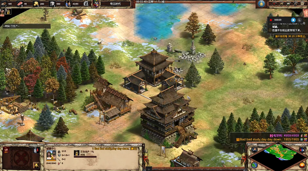 游戏开局你位于地图中心,周围强敌环伺,因此首要任务是保证经济安全运转并构建基础防线。你需要立即安排村民高效采集附近的木材和食物,确保农民持续生产,并尽快升级至城堡时代,为后续爆兵提供科技支持。利用初始资源在关键路口和资源点附近建造哨兵塔或城堡,形成交叉火力进行早期防御,特别注意波斯精锐骑兵的早期骚扰,使用弓箭手在其必经之路进行游击可以有效保护你的经济不被干扰。