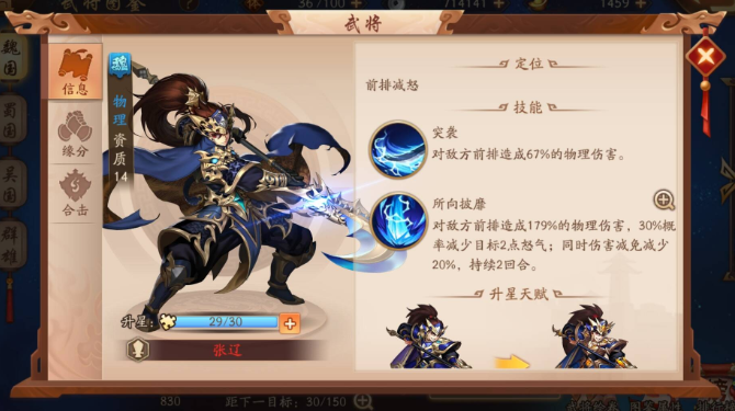 张飞在游戏中是一位爆发型武将,主打一列伤害和暴击加成。他的技能万夫不当能对敌方一列造成高额物理伤害,并附带额外暴击率和暴击强度,触发概率较高。如果搭配刘备上场,还能激活豪情合击技能,进一步提升输出能力。前期获取和培养张飞的难度较低,蜀国阵营