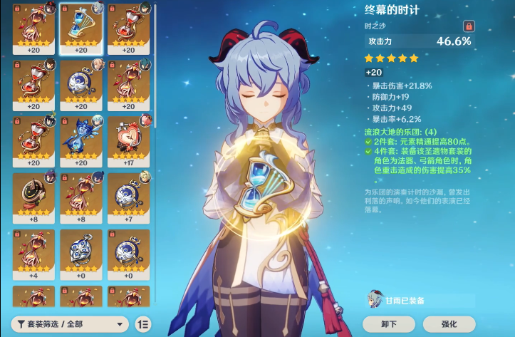 乐团套装最大的特点就是能增强元素精通和重击伤害,特别适合那些靠重击打输出的角色。两件套效果直接加80点元素精通,四件套效果更厉害,能让法器或弓箭角色的重击伤害提高35%。这么一看就知道,这套装备对特定玩法的角色帮助特别大。这套装备最适合给那