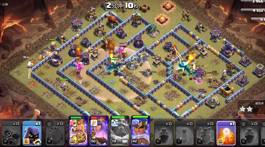用好法师的核心,是依托肉盾前排创造安全输出环境,配合分散部署、精准法术与清边断边操作,最大化范围伤害并规避范围防御与陷阱,同时适配主流流派形成稳定战术。法师作为远程范围输出兵种,自身血量薄弱,绝对不能单独前置部署,必须搭配巨人、石头人、皮卡超人等肉盾单位,先让前排吸收迫击炮、法师塔、X连弩等防御的火力,待仇恨稳定后,再从侧翼或后排分批放下法师。部署时切忌扎堆,要采用分散一字排开或小集群间隔投放的方式,避免被巨型炸弹、法师塔的范围伤害瞬间团灭,同时扩大火力覆盖面积,高效清理群体