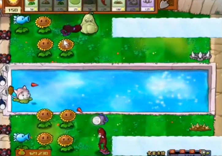 全面冻结这关的核心是快速融化冰面并阻止雪橇僵尸制造新冰道。咱们需要带上关键植物:火爆辣椒、地刺、地刺王、向日葵、窝瓜、土豆雷、荷叶和水草。火爆辣椒能瞬间清掉冰面,地刺和地刺王则是防御主力,向日葵保证阳光供应,窝瓜和土豆雷用来应急。开局先在后排种两排向日葵,水上用荷叶铺好,前期阳光紧张时优先用土豆雷或窝瓜对付雪橇车僵尸。