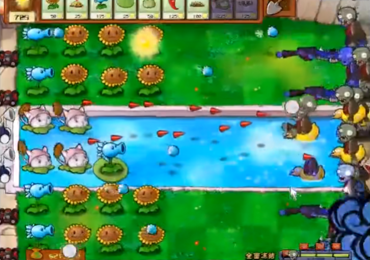 中期阳光充足时,可以在水上补两排单发豌豆射手,陆地防线成型后基本不用操心。地刺被啃掉要马上补,尤其是对付雪橇车时。如果僵尸扎堆,可以用樱桃炸弹救场,但别依赖它,毕竟冷却时间太长。关键是把火爆辣椒留给冰道,窝瓜留给漏网的雪橇车,其他交给地刺慢慢磨就行。