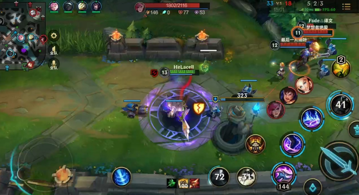 实战中需注意技能释放顺序:Q起手沉默接E技能持续输出,W用于抵挡关键伤害,R技能作为终结手段。对线期以Q+E消耗为主,利用被动回复保持血量优势;团战阶段需优先切入后排或保护己方输出,通过R技能改变战局。盖伦缺乏位移技能,需依赖闪现和地形视野进行突袭或撤退。